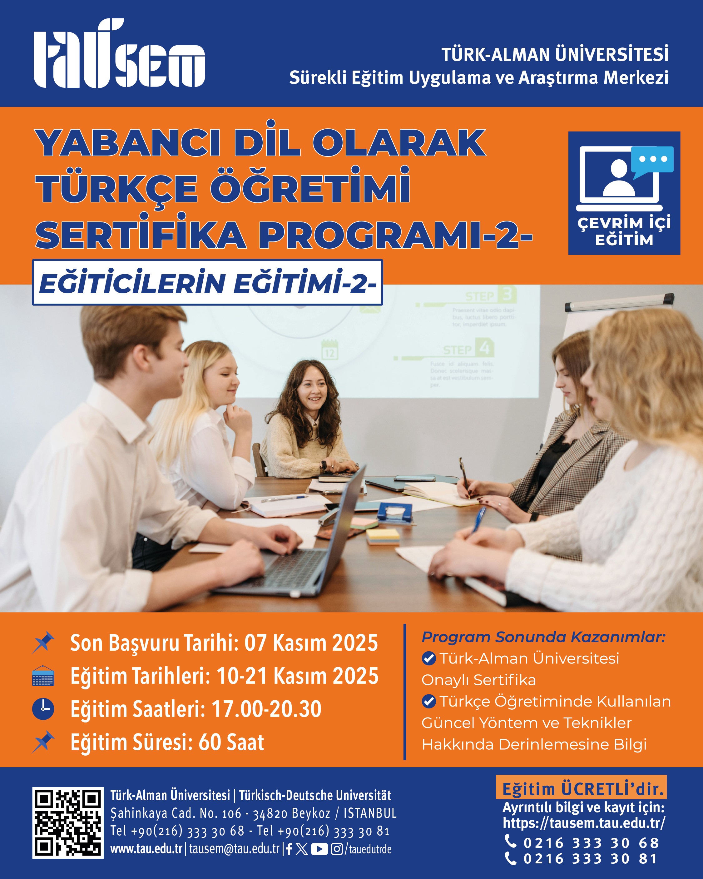 Programla ilgili ayrıntılı bilgi almak ve ön kayıt oluşturmak için takip eden linki kullanabilirsiniz: https://tausem.tau.edu.tr/yabanc%C4%B1-dil-olarak-t%C3%BCrk%C3%A7e-%C3%B6%C4%9Fretimi-sertifika-program%C4%B1-%28e%C4%9Fiticilerin-e%C4%9Fitimi%29