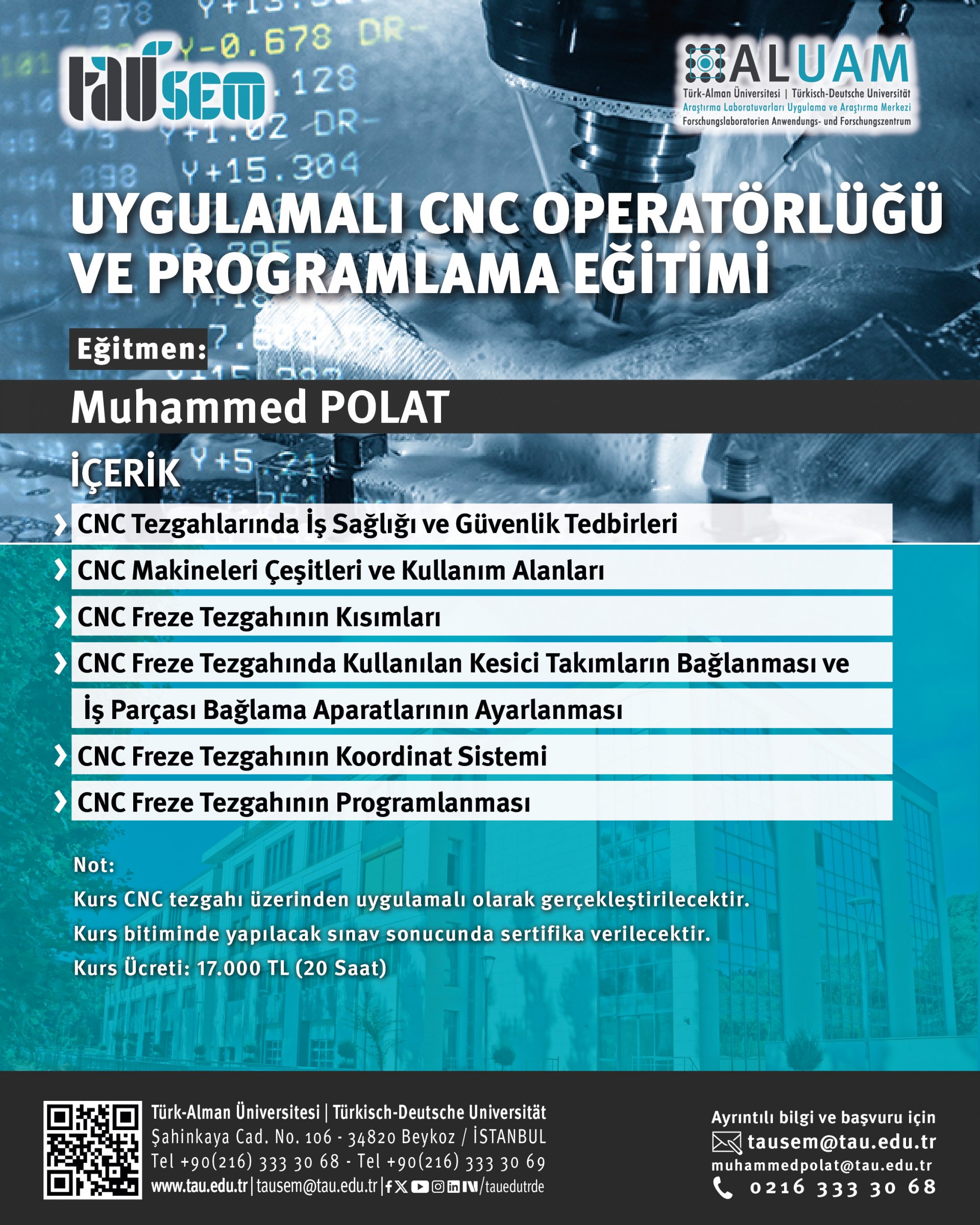 Türk-Alman Üniversitesi ALUAM (Araştırma Laboratuvarları Uygulama ve Araştırma Merkezi) öğretim elemanlarının TAÜ-SEM bünyesinde yüz yüze olarak verilecek olan Uygulamalı CNC Operatörlüğü ve Programlama Eğitimi için kayıtlar kabul edilmeye başlanmıştır. Kursiyer yeter sayısına ulaşılması durumunda (minimum 5 kişi) kurs programları açılacaktır.