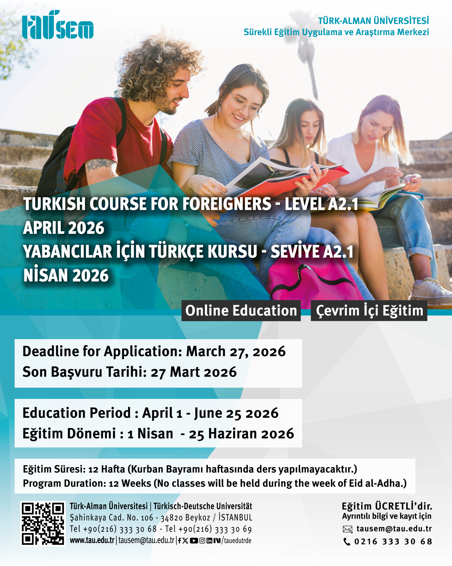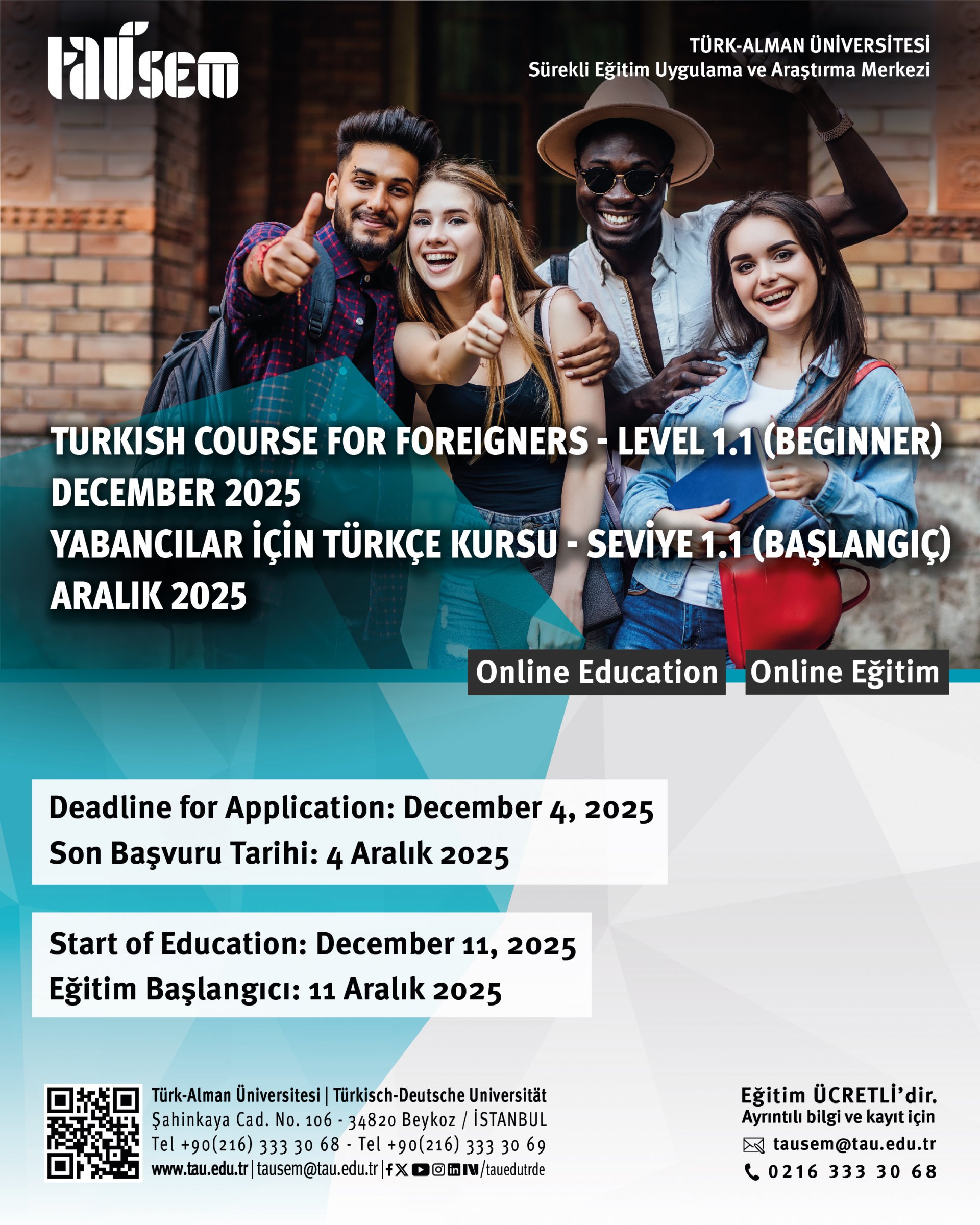 Türk-Alman Üniversitesi öğretim elemanlarının TAÜ-SEM bünyesinde online olarak vereceği Aralık 2025 Dönemi Başlangıç Seviye Türkçe Kursu için kayıtlar kabul edilir. Kursiyer yeter sayısına ulaşılması durumunda (minimum 15 kişi) A1.1 Başlangıç Seviyesinde Türkçe Kursu açılır.